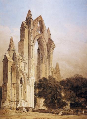 Thomas Girton, an exact contemporary of Turner, made sketches of the ruins of Guisborough Priory in 1801/02. The dramatic skelton, an outstanding example of 14th century Gothic architecture, is the east end of one of the earliest Augustinian priories in England.  Girton's paintings add drama by emphasising the verticality of the architecture silhouetted against the sky.   The Priory is in the care of English Heritage and is managed by Gisborough Priory Project.  The images are of a watercolour held by Tate Britain and an oil painting held at Yale University, neither on display.